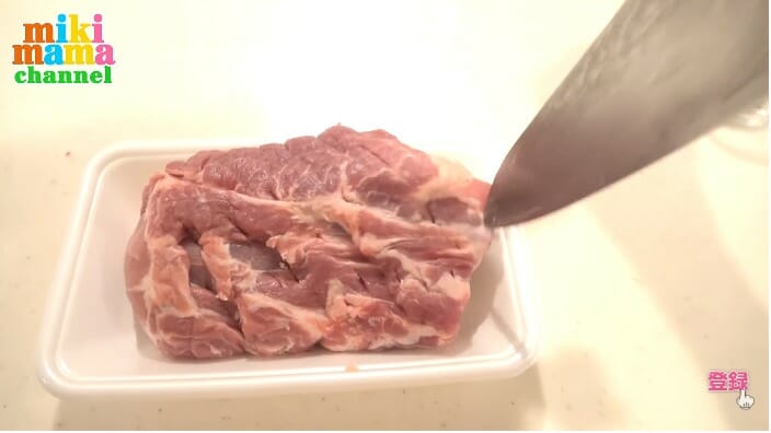 まずはオーブンを210℃に予熱。豚のブロック肉の筋を切るように、全体を30か所ほど包丁で刺す。