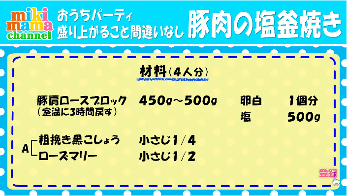 みきママの「豚肉の塩釜焼き」に必要な材料はコチラ↓