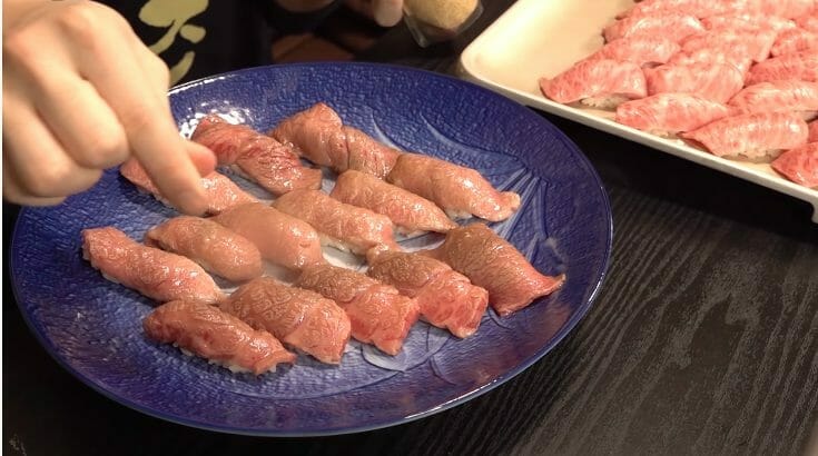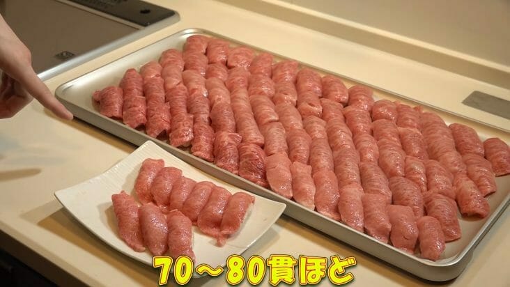 今回は、精肉店に協力してもらい手に入れたお肉で「肉寿司」を作り、それを大食いしていく動画である。