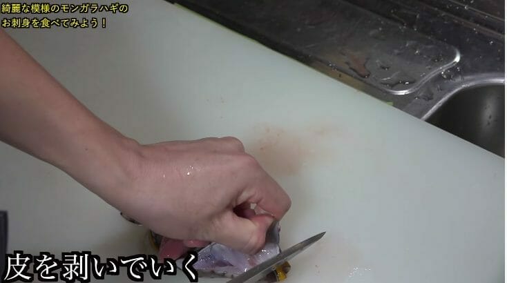 食用で頂いたモンガラハギを刺身にするため、さばいていくのだが、皮がかなり硬いらしく、とても剥ぎづらい様子だった。