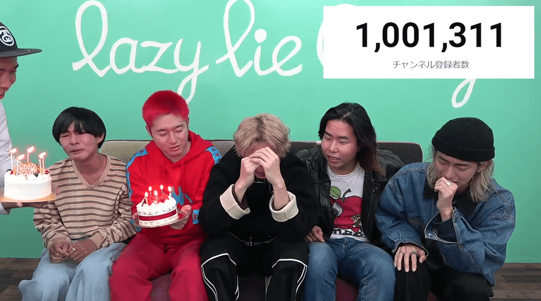 チャンネル登録者100万人を達成後、5本のろうそくが立ったケーキを受け取った5人は、「こんな俺たちを登録してくれて」「夢って叶うんやな」「みんなに出会えて良かった」「いい人生やな」などと、画面の向こうのファンに感謝を伝えた。
