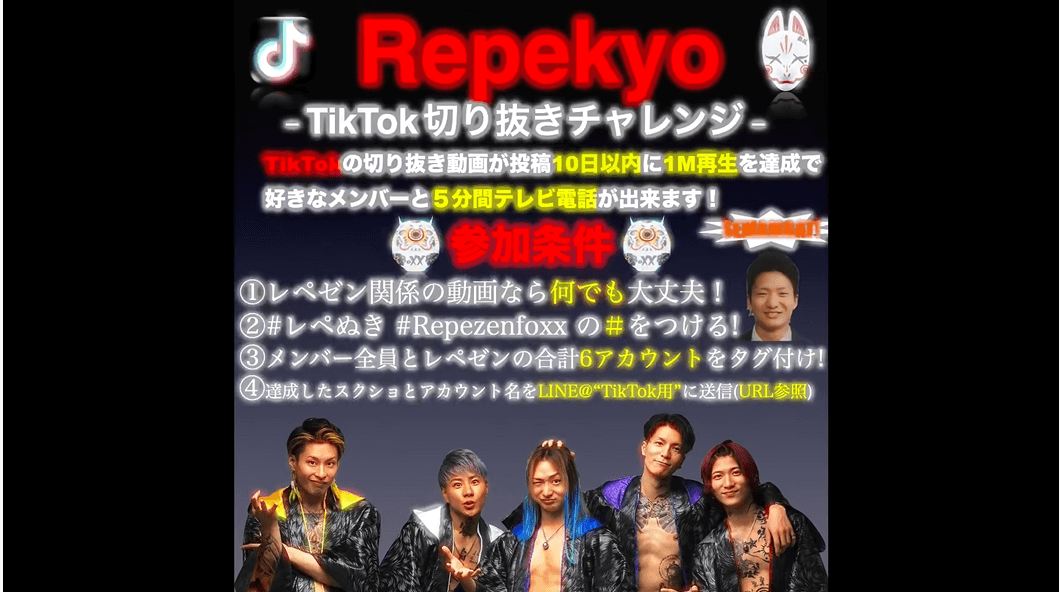 「TikTok切り抜きチャレンジ」は、Repezen Foxx関連の切り抜き動画をTikTokに投稿し、10日以内に1ミリオン再生した人は、好きなメンバーと5分間テレビ電話ができるというもの。