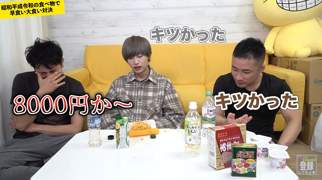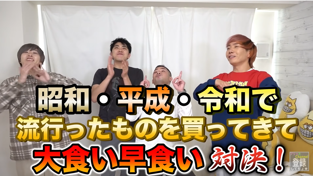 今回の企画は、昭和・平成・令和で流行ったものを買って来て大食い&早食いするというもの。
