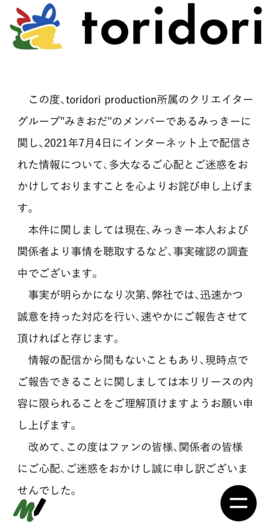 こはくぶちょーの知人からコレコレ配信に暴露があった当日、みっきーは活動休止の動画をアップした。この時みっきーは、こはくぶちょーとのことには何も触れず、ただ休止のお知らせだけの動画投稿だった。コレコレの配信により大炎上をしていたので、みっきーの活動休止とは何らかの関係があると思われる。