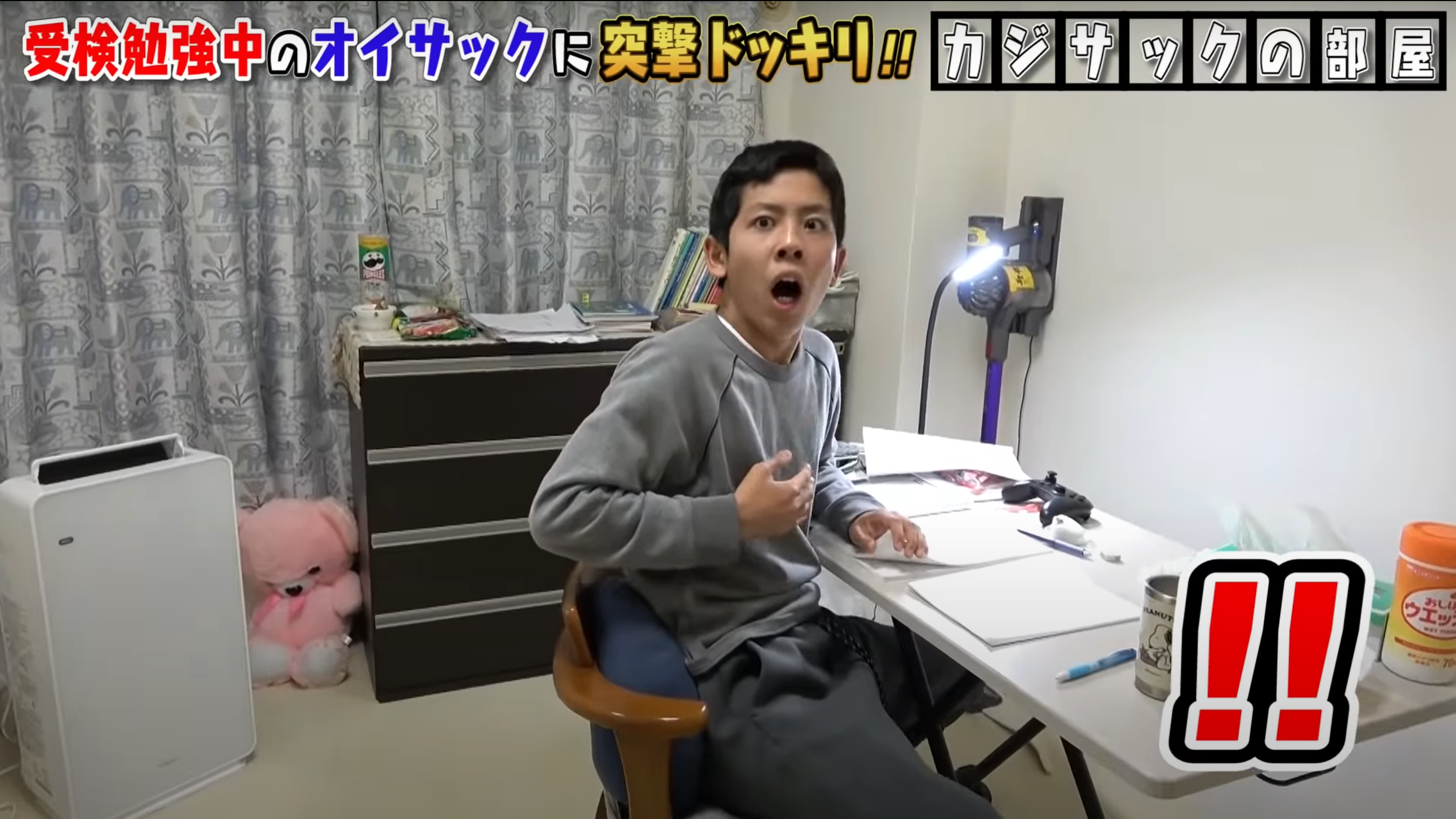 動画では、カジサックは、オイサックの勉強部屋へ、音もなく近づき、いきなり突撃。それに対し、入試に向け数学の問題を解いていたオイサックはうわぁ!と悲鳴をあげ、「びっくりした」とかなり驚いた様子だった。