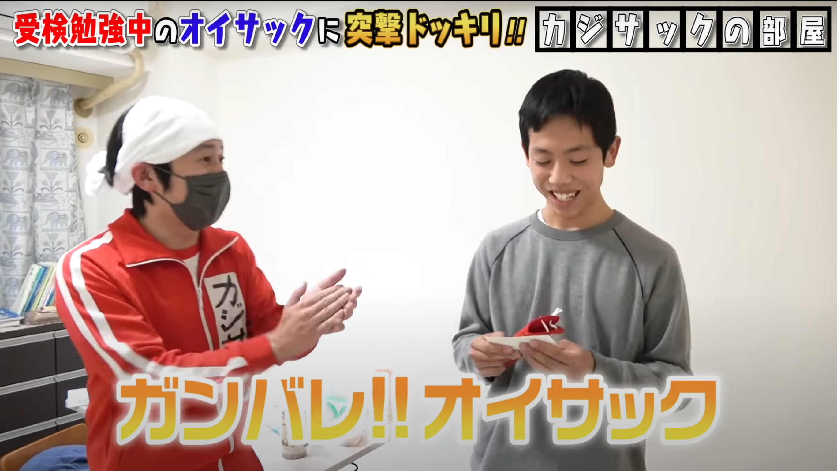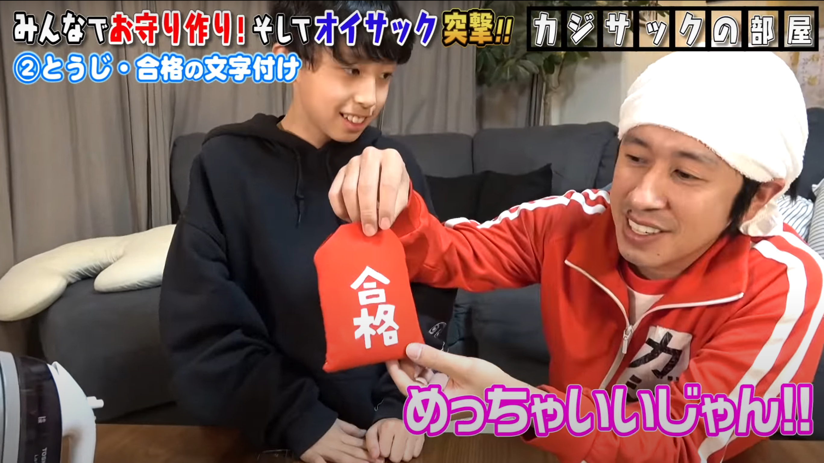 さっそく、カジサックはオイサックに、手作りの合格祈願お守りを渡すと、オイサックは「嬉しい」「ありがたっ」と喜びを顕わにした。その後、カジサックの子ども達、とうじ、かんな、こじ、せんちゃんのメッセージを読んだオイサックは、ひとりひとりに感謝のメッセージを返した。さらに、「こういうのがな。マジ一番元気なんねん」と嬉しそうにしていた。最後に、カジサックは、「ガンバレ!!オイサック」と動画を締めた。