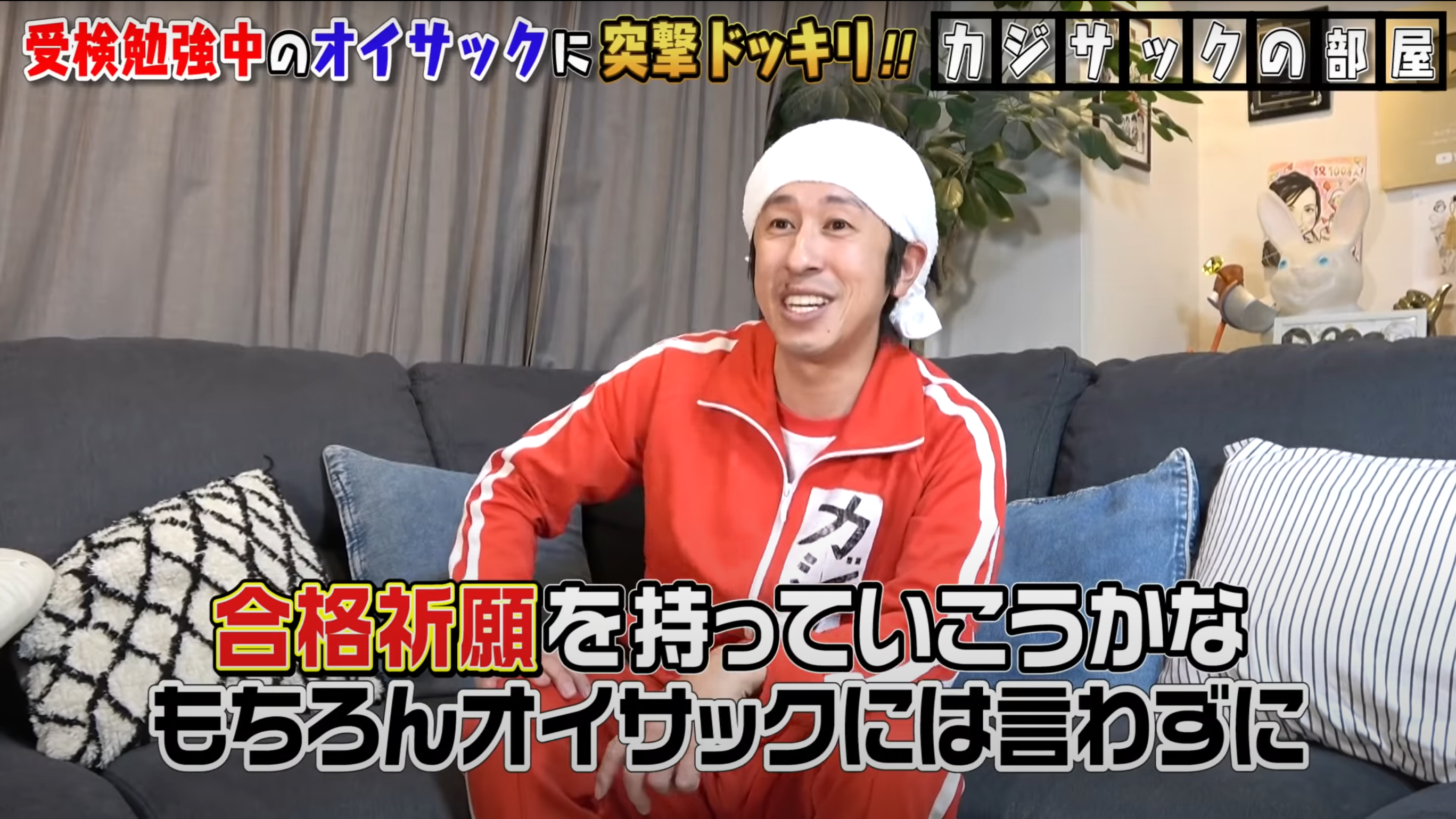 動画では、受験生のオイサックの話題となった。オイサックは、現在、勉強に集中するために、カジサックの母の実家で毎日勉強しているそうだ。カジサックは、オイサックのその状況に、何かできないかと考え、サプライズで合格祈願を持っていく事にしたという。そこで、カジサックは、学問の神様として知られる菅原道真公を祀っている湯島天神のお守りと、カジサックとカジサックの子供達(オイサックからみた従弟達)で手作りの合格祈願お守りを渡すことにした。ちなみに、湯島天神のお守りは、カジサック、ヨメサック、チームのみんなが用意したものである。