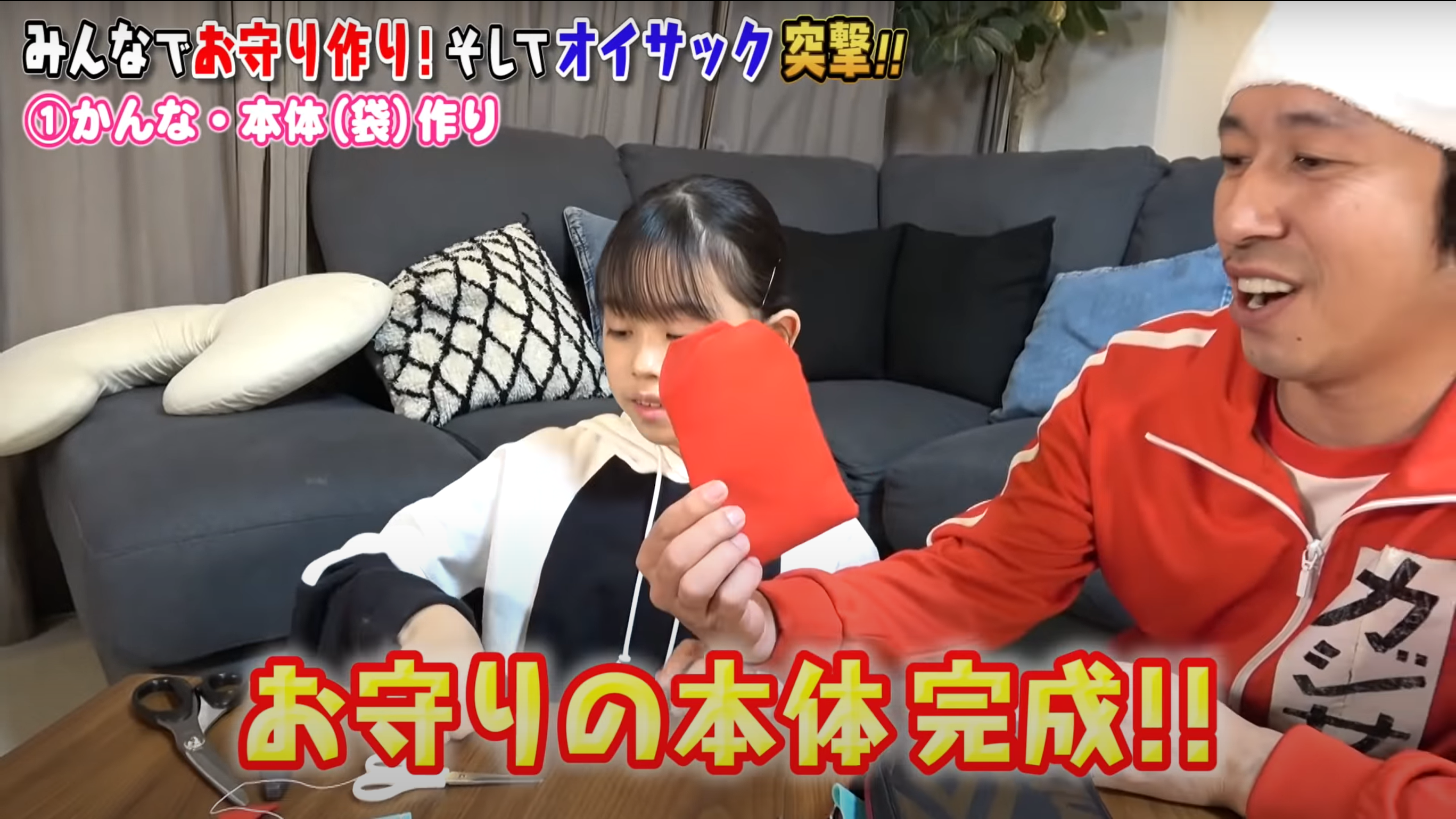 お守りの本体(袋)作成は、かんちゃんと呼ばれる、カジサックの長女かんなが担当した。この企画に対して、かんちゃんは「絶対そう君(オイサック)喜んでくれるよ」と楽しみにしていたようだ。また、この工程を担当して、かんちゃんは「楽しかった」と、久しぶりの裁縫を楽しんだようだった。