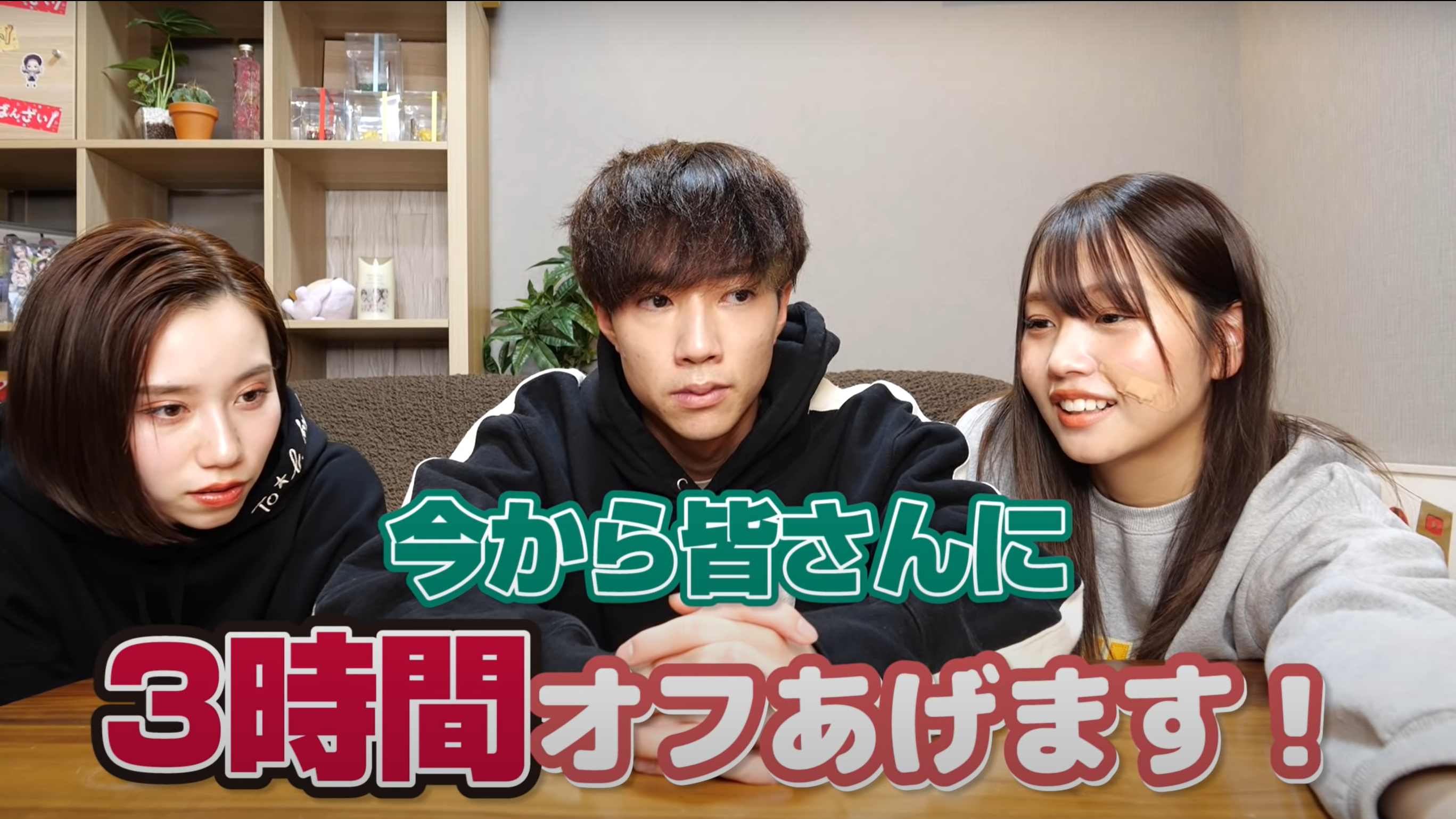 動画の冒頭、なにも知らされずに集められたばんばんざいのぎし、みゆ、るなの3人に、突然「今から皆さんに3時間オフあげます!」と伝えれる。それを聞いた3人は「3時間はめちゃくちゃデカいよね」「普段できひんことめっちゃできるんちゃう?」と嬉しそうな様子。ただ、カメラは回さないといけないという条件付き。