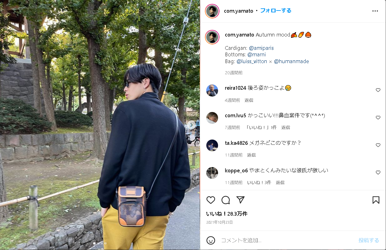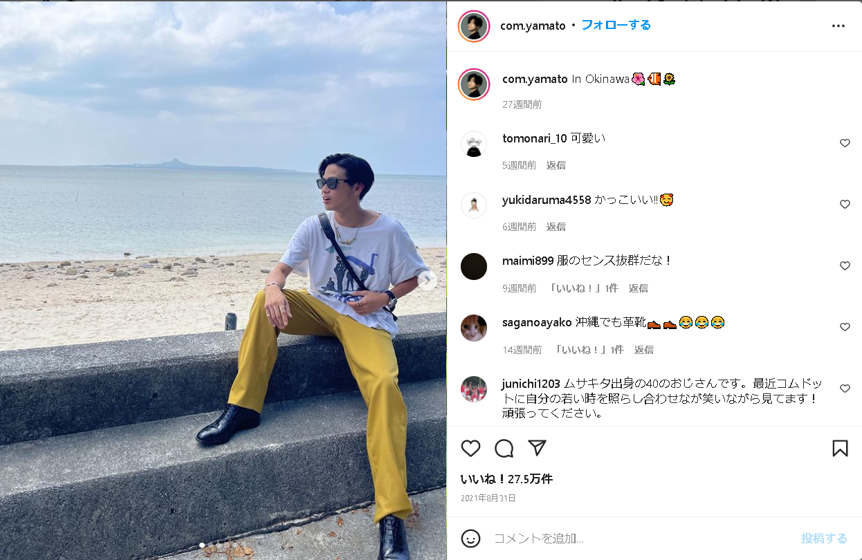 写真の相手はすぐにコムドットやまとだと特定された。その証拠は、2021年8月にやまとのInstagramに投稿されていた写真である。やまとが履いているボトムスと靴が、匂わせ画像と全く同じなのだ。