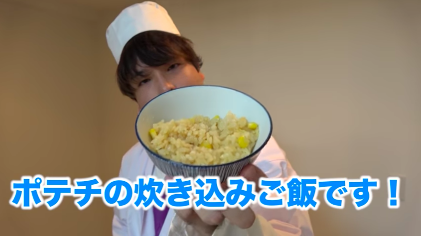 コーンやベーコンとともに、ユーチューバーチップスを炊き込んだご飯。