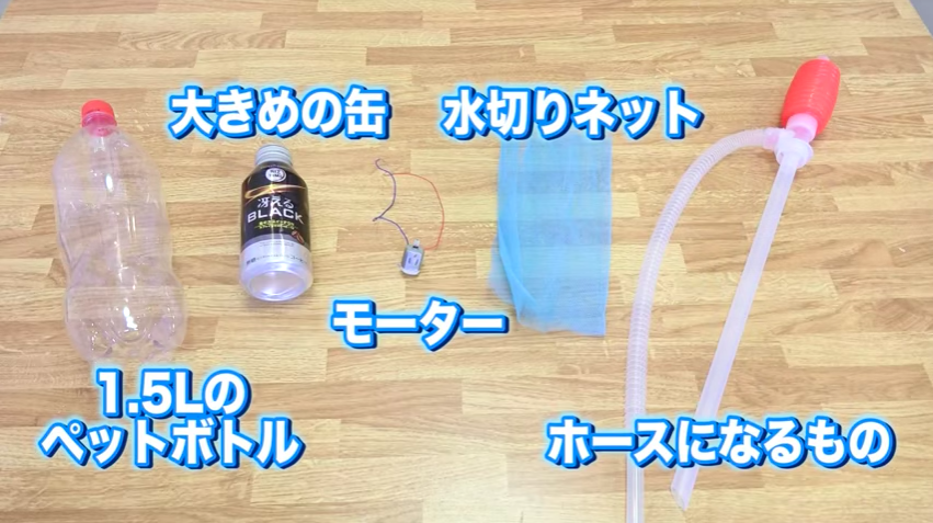 掃除機づくりに使うのは、ペットボトルやモーター。