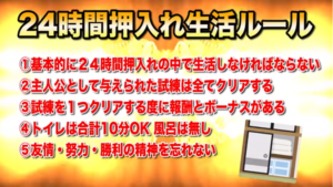 24時間押し入れの中で過ごし、与えられた試練をすべてクリアすることが基本ルールとなり、試練を一つクリアするごとに報酬とボーナスが発生する。お風呂タイムはないが、合計10分までのトイレタイムは可とされている。そして、「友情・努力・勝利」の精神を忘れないことが大前提だ。