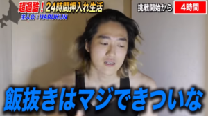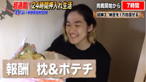 先ほどのトランプタワーが堪えたのか、「失敗はない(時間がかかってもいつか終わる)から頑張れるかも」と前向きな様子だ。しかし狭い押し入れ、広がる納豆臭。だが1時間30分後、見事試練を達成した。