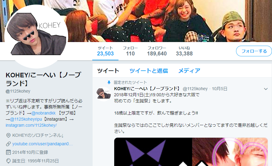 ノーブランドKOHEYの生年月日は、ツイッターのプロフィールなどに1995年11月25日と記載されており、2018年10月31日現在の年齢は22歳となる。