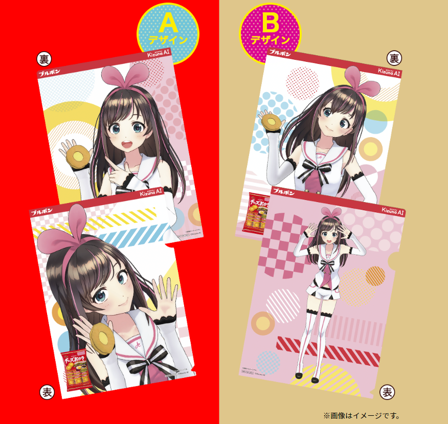 キズナアイのクリアファイルが入手できる対象商品は、チーズおかき商品(チーズおかき、大人プチチーズおかき、ミニチーズおかき)を含むブルボン菓子商品。