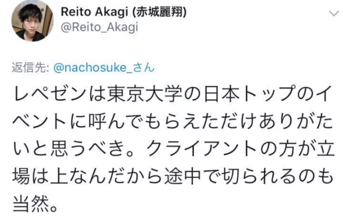 更に、その後東大生と思われる人物が「レペゼンは東京大学の日本トップのイベントに呼んでもらえただけありがたく思うべき」と上から目線のツイートを投稿したことで更に炎上が加速。
