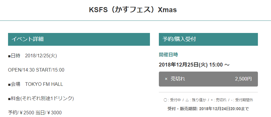 予約は明日20:00から下記のURLにて開始です✌︎(‘ω’✌︎ )https://t.co/NdX40lOWUV#KSFS pic.twitter.com/SxsYiU4KPU— 12/25 KSFS(かすフェス)Xmas 開催決定? (@KSFS_IDOL) 2018年11月26日