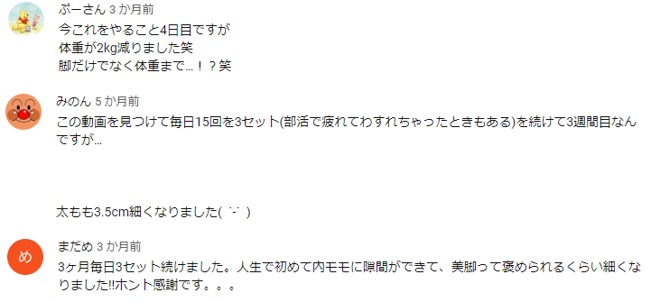 こちらの動画では、2週間で脚が細くなるというねこあや考案の美脚トレーニング法が紹介されているのだが、実際かなり効果があるらしく、コメント欄がファンからの感謝の言葉でびっしりと埋め尽くされているのだ。