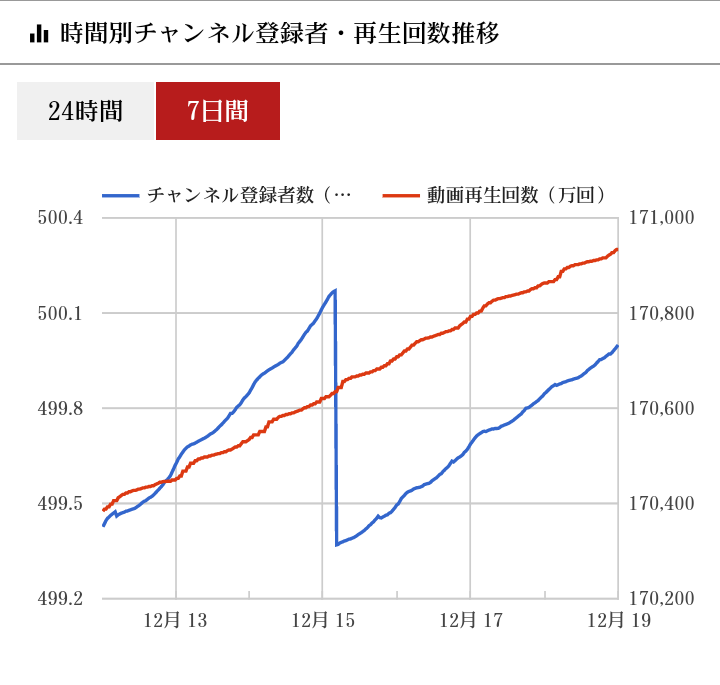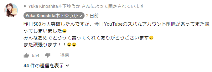 しかし、その後2018年12月19日、木下ゆうかのメインチャンネルの登録者数が改めて500万人を突破した。