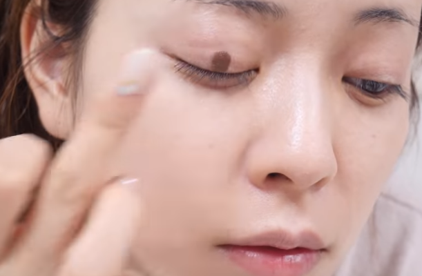 ブラウンのクリームシャドウをまぶたの中心にのせ、指でぼかしていく。