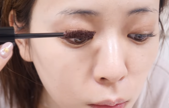 まつげにはブラウン系のマスカラを使用。上下のまつげに軽くのせていく。