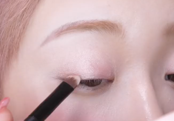 ピンクカラーだけだとぼんやりとしたイメージになるので、目尻にマッドブラウンのシャドウを重ねて影を作る。
