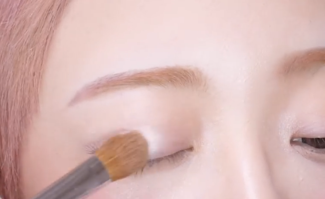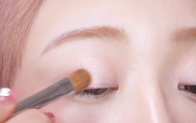 ピンクベージュのシャドウをアイホール全体になじませる。