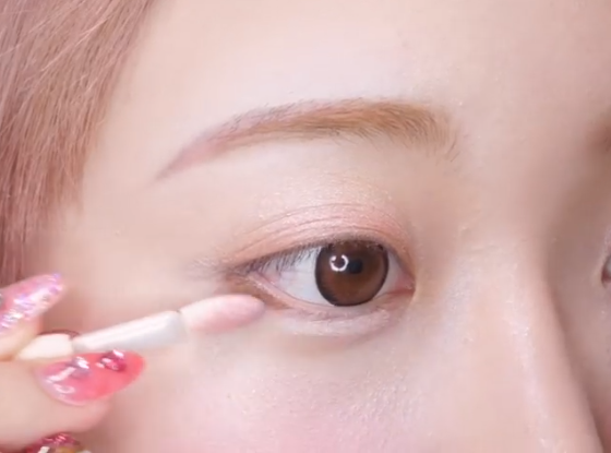 アイホールに使用したピンクベージュのシャドウを涙袋にのせていく。