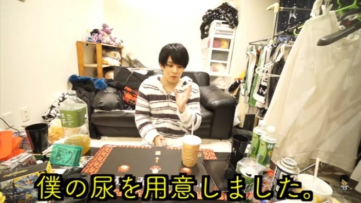 動画冒頭、「飲尿健康法」という言葉を用いて、用意したのはなんと自分の尿。