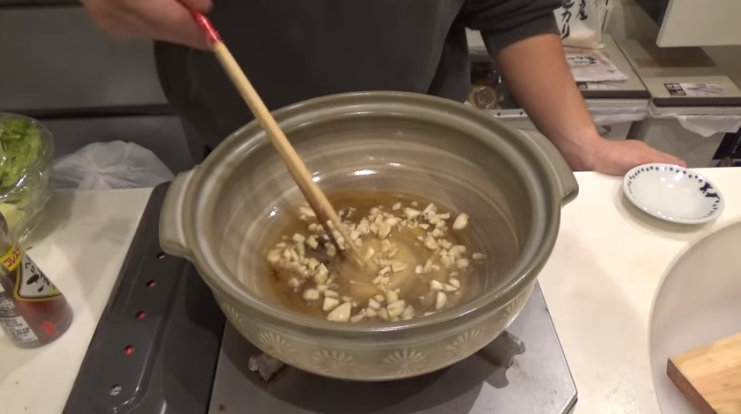 ごま油が温まったらにんにくを投入し、炒める。