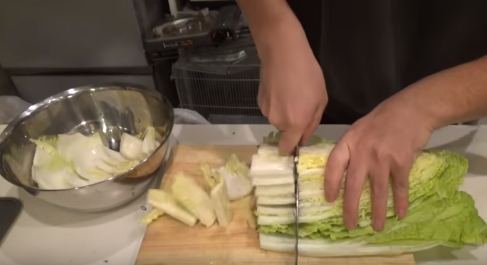 白菜はほうれん草と同じく、芯を落としってから一口サイズに切る。