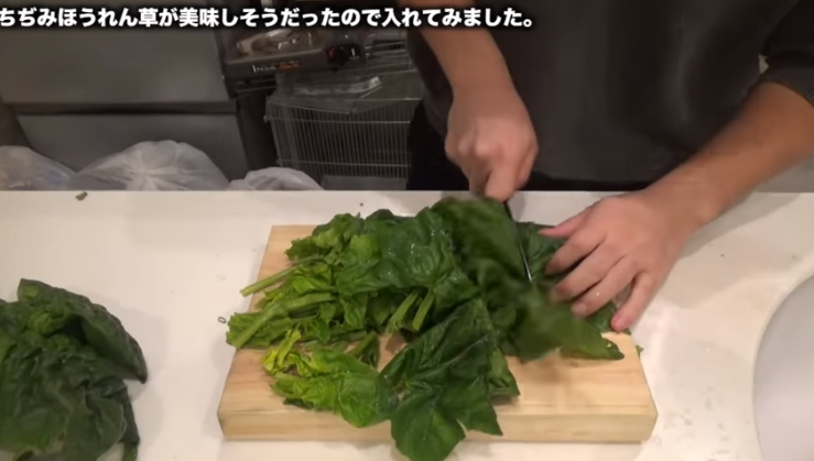 ちぢみほうれん草を一口サイズに切っていく。