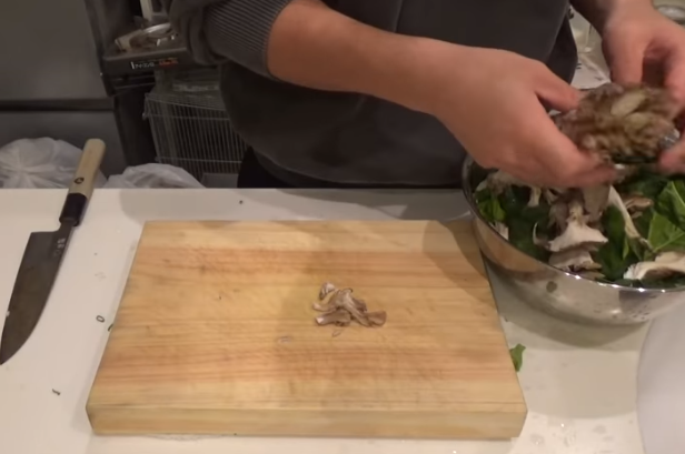 舞茸は石づきを切り落とし、お好みのサイズに手でむしっていく。