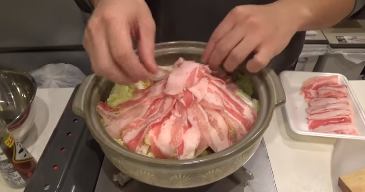 まず一番下に白菜を敷き詰め、その上に豚バラ肉を上画像のように1枚1枚放射状に重ねていく。