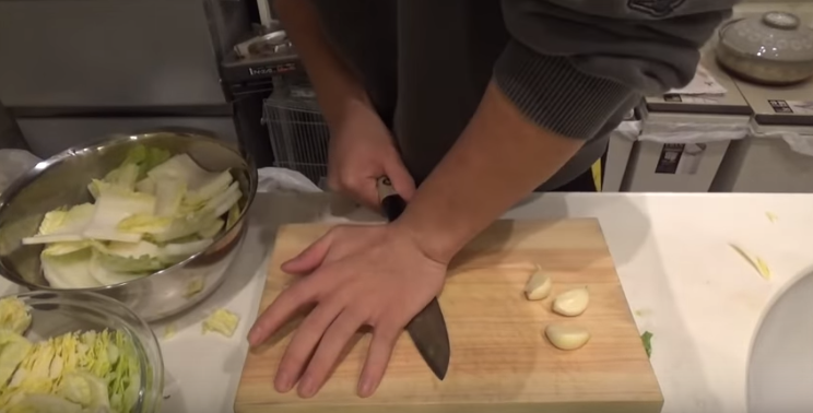 上画像のように包丁の背でにんにくをつぶすことによって、簡単に芯を取り除くことができる。