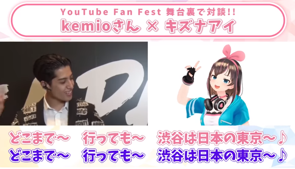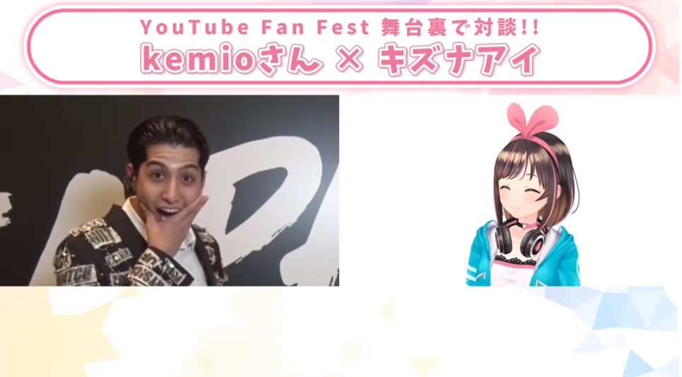 YTFFの舞台裏で対談したkemioとキズナアイはお互いを「アイちゃん」「kemioちゃん」と呼び合い、初対面にも関わらず仲のよさそうな2人。