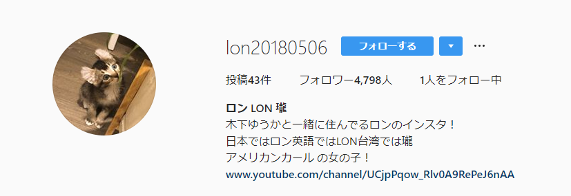 こちらのアカウントではもちろん全ての投稿がロンの写真・動画であり、木下ゆうか自体に興味がなくとも動物や猫好きの方にはたまらないにゃんこアカウントとして人気を集めている。