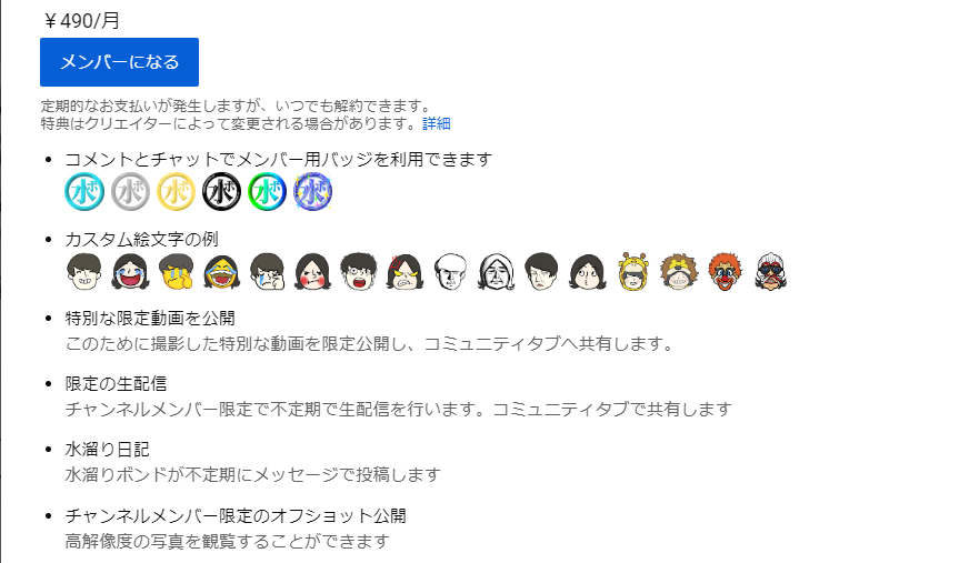 「チャンネルメンバーシップ」は、チャンネルメンバーになることによって、そのチャンネル独自のバッジや絵文字、その他の特典を得る事が出来るのがメリットになっている。