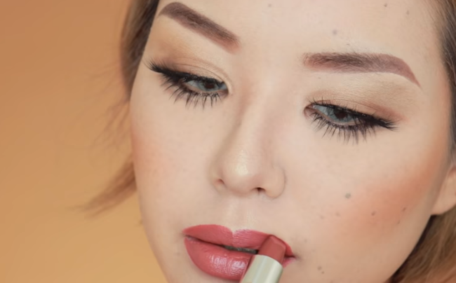 最後に、ブラウン系のリップをしっかりと塗り、完成。