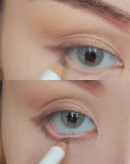 ブラウンのペンシルライナーで上瞼は中心から目尻、そして下瞼は目尻から目頭にかけて囲んでいく。