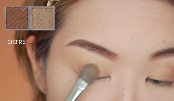 まずはじめにゴールド(上画像参照)を筆に取り、アイホール全体から眉下にかけて乗せていく。