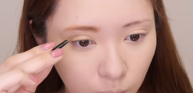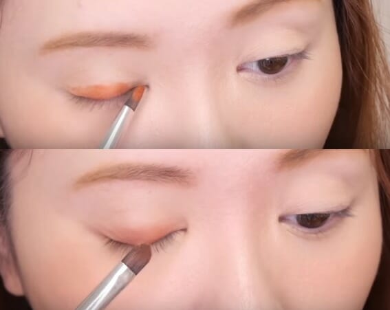筆に取り二重幅の中心部分に色を乗せ、柔らかい筆を使い中心から外側に向けてアイホール半分ぐらいの範囲にぼかしていく。
