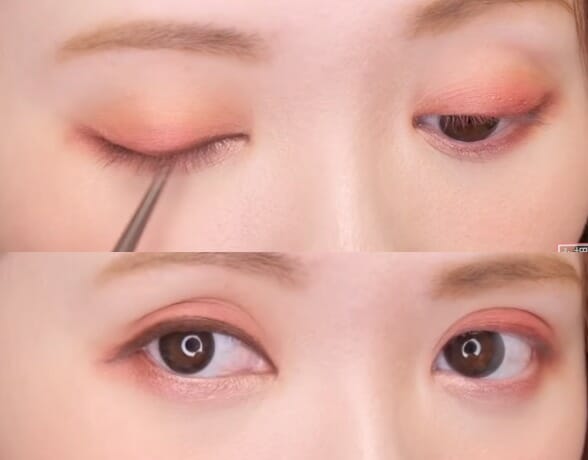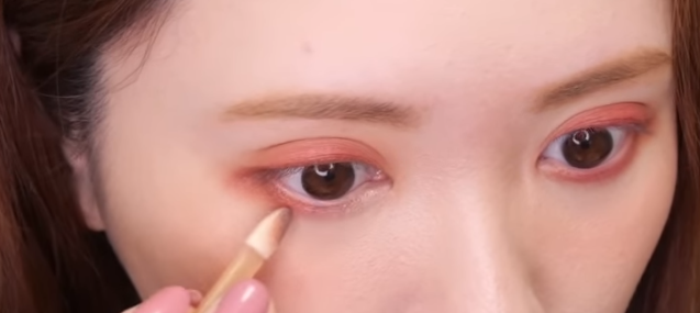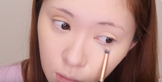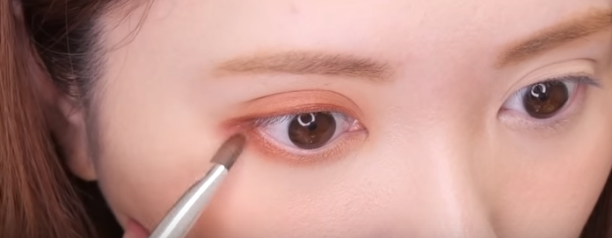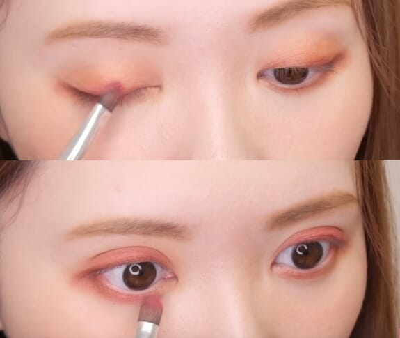 更にダークブラウンのカラーを筆に取り、目の中心から目尻、目尻から下瞼3/4ぐらいにかけてぼかしながら細めに縁取りをしていく。