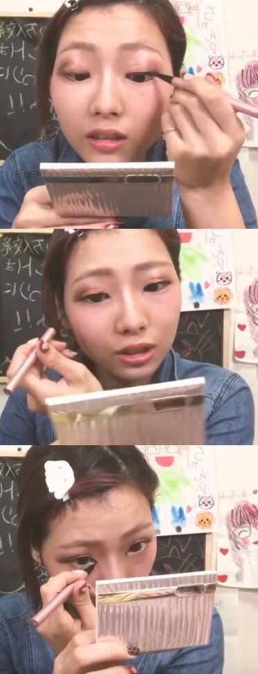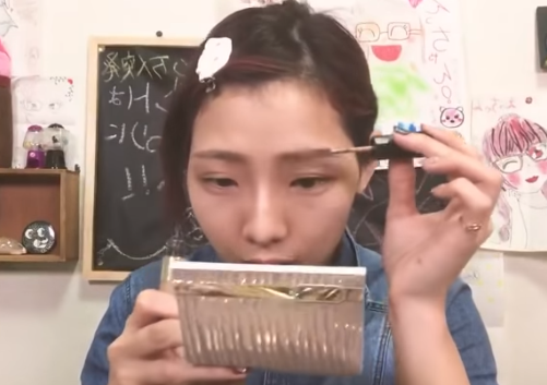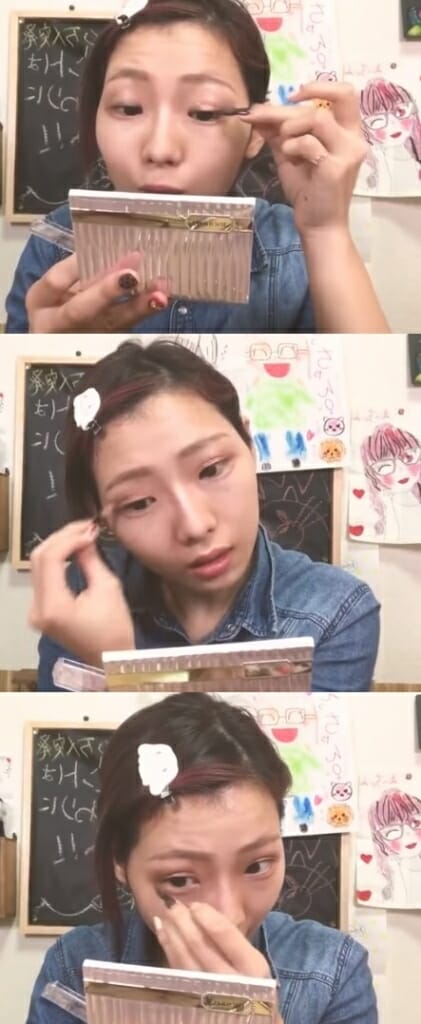 眉毛の書き方は人によってそれぞれだが、えっちゃんの場合は絵を描くようにシュッシュッと長い線を一本一本描き足している。