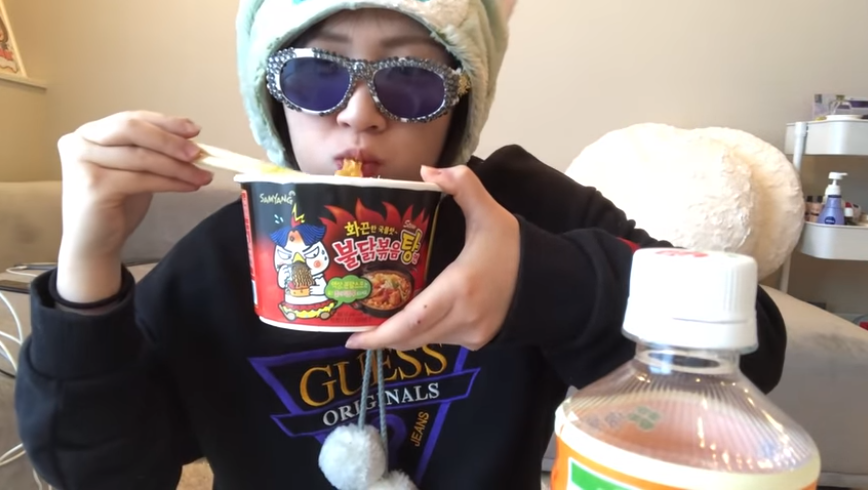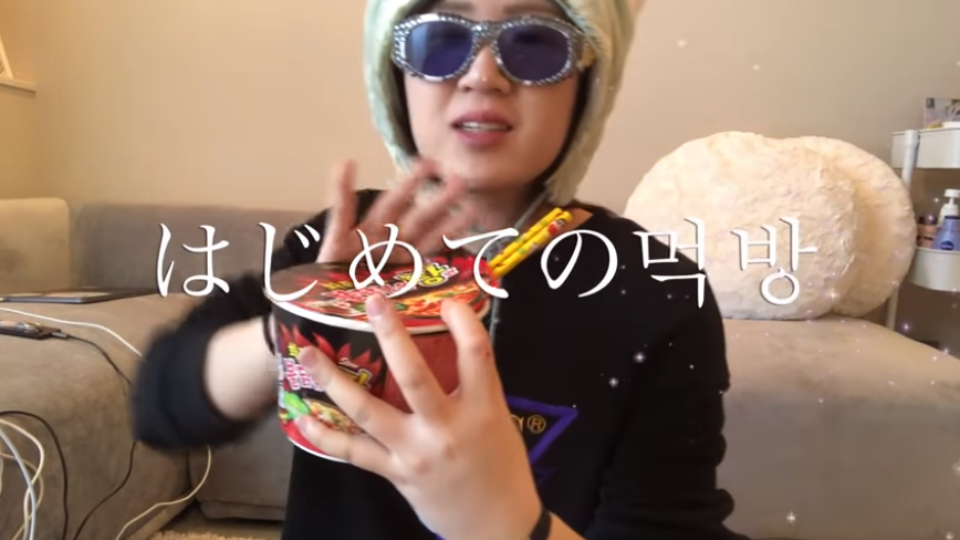 この動画は古川優香の妹が被り物とサングラス姿で登場し、プルダックポックンミョンを食べながら雑談するというもの。