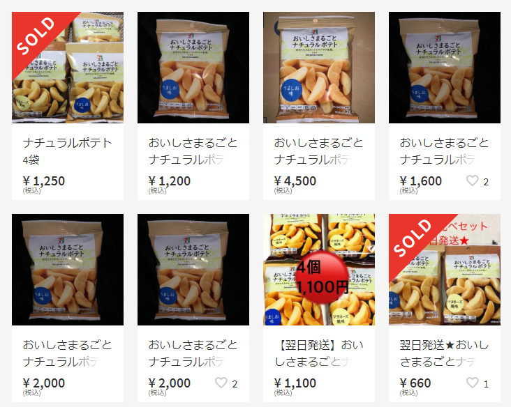 なんと、ナチュラルポテトの売り切れが騒がれるようになってすぐにメルカリやヤフオクなどのオークション・フリマアプリでナチュラルポテトが通常価格(税込み127円)の10倍近くの価格で転売されていたのだ。