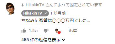 詳しい金額については明かされることはなかったが、コメント欄でヒカキンはセカンドハウスの家賃が3桁以上、つまり100万円オーバーであることを告白している。