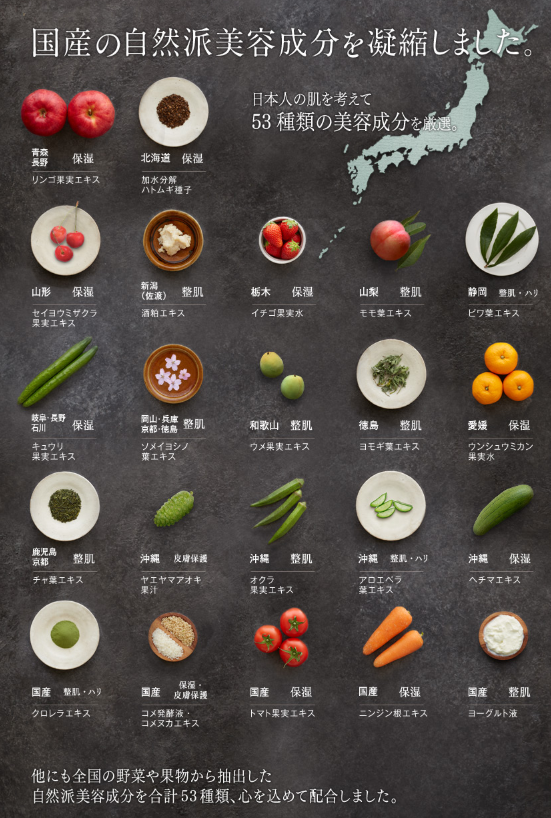 このように、肌に良いとされる自然派美容成分を53種類も配合しており、全て選びぬいた純国産の野菜・食材を使用している。