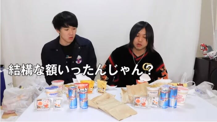 3000円分揃うことを目標にして買い物を済ませた2人は『レッドブル』『味付き卵』『カップヌードル3種』『からあげクン』などを揃え、順調な出だしを見せる。